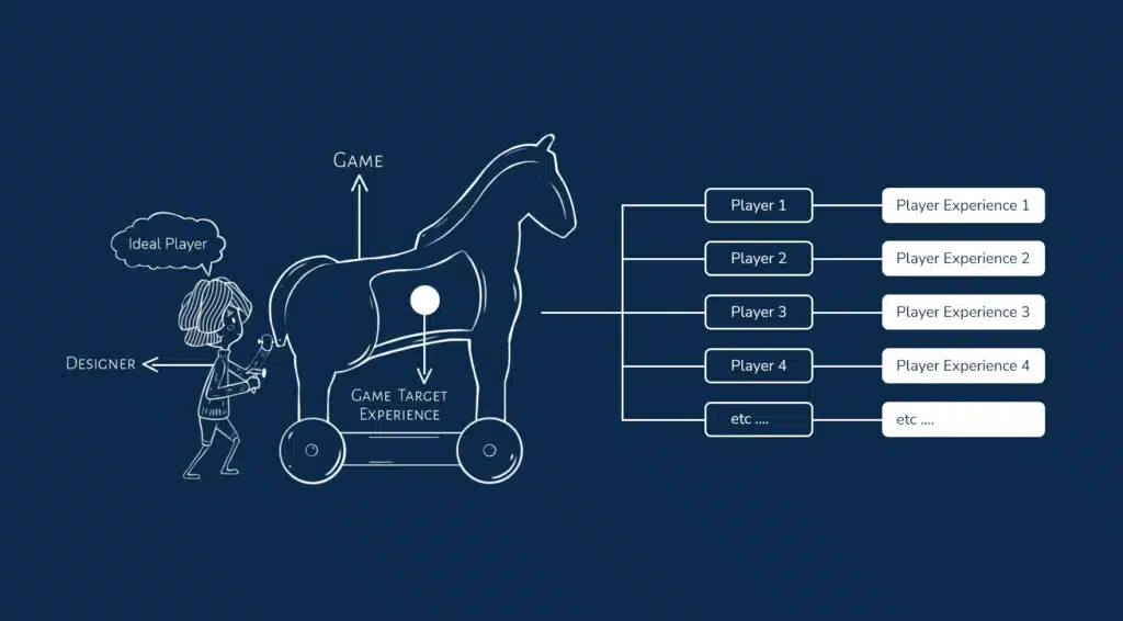 This makes game development a sort of “reverse-engineering process”. You first define the experience you want to achieve and then develop the best game that generates it. A game is like an orchestra with all the instruments working together to make the desired experience emerge. But, you need to be aware that, until you release the game, you lack a fundamental “instrument”: the Player.